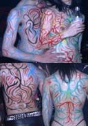 17日におしゃれ変態クラブベントのトーチャーガーデンでボディーペインティングを部屋の片隅でやらさせていただきました。 楽しかった。楽しかった。 今回でボディーペインティングするのは3回目で、いろいろ可愛い模様考えてたのに結局トライバル(カラクサ模様がシャープになった感じのやつね)みたいのしかできんかった。人前で描くっていうのはずかしくて考えてたものがぶっ飛ぶね。今度やる時は、もうちょっとボディーペインティングの勉強して行こう。